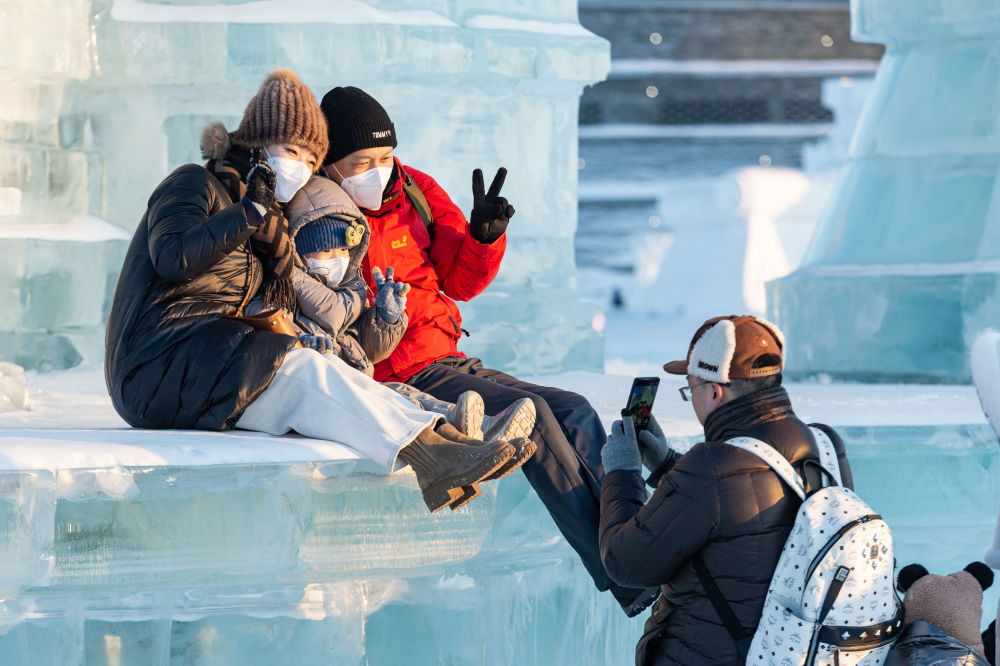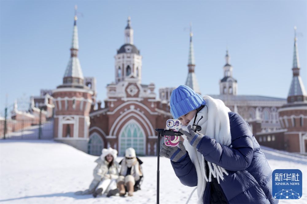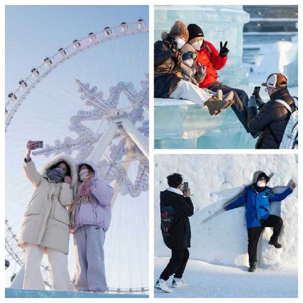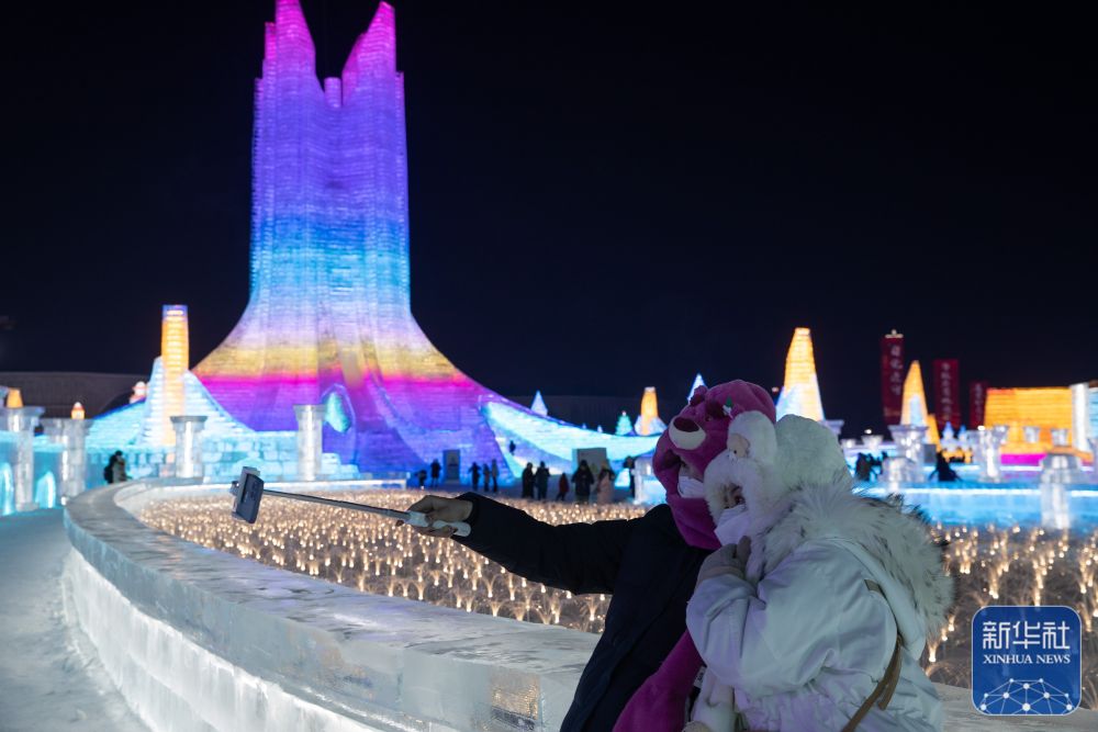 ↑2022年12月31日,游客在哈尔滨冰雪大世界园区拍照留念。新华社记者 张涛 摄