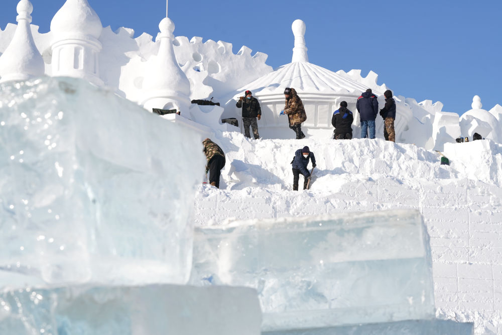 2022年12月18日,雪博会园区工作人员在进行大型雪塑的收尾制作工作。