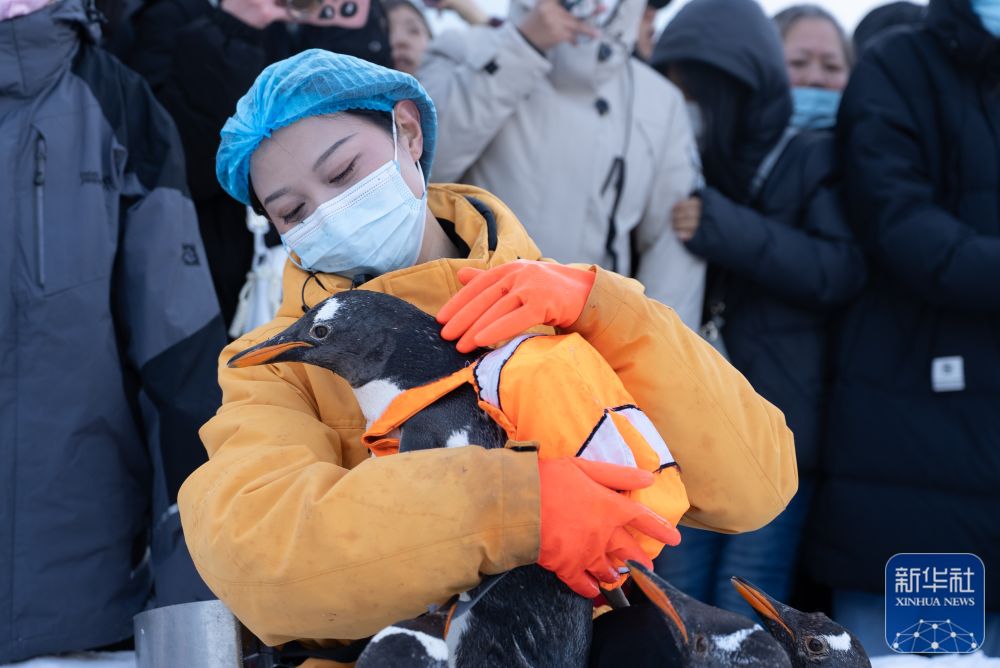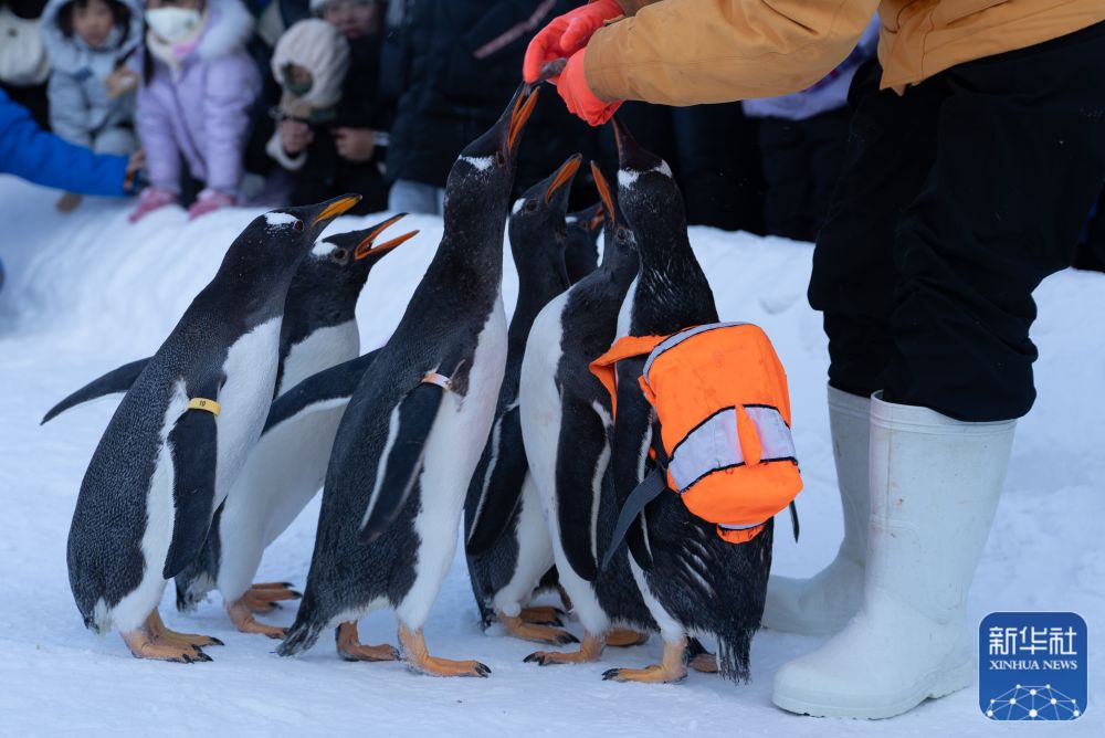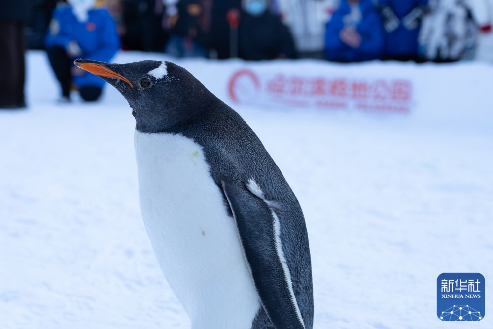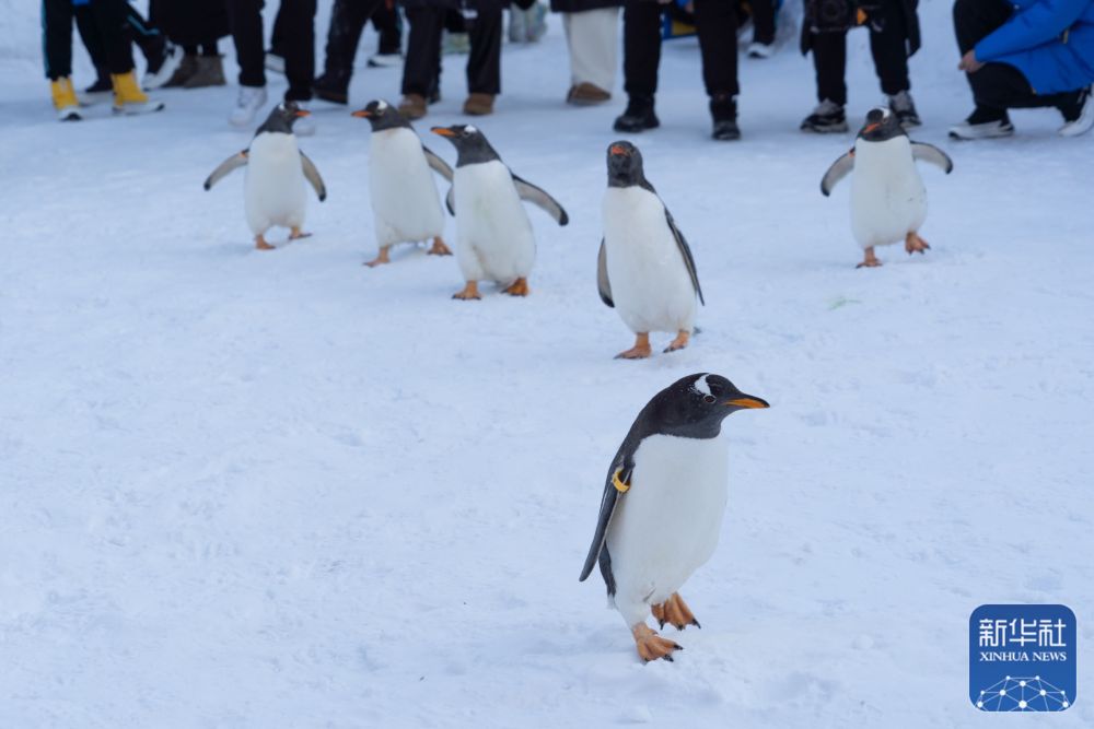 12月3日,哈尔滨极地公园的企鹅在户外进行冰雪巡游。
