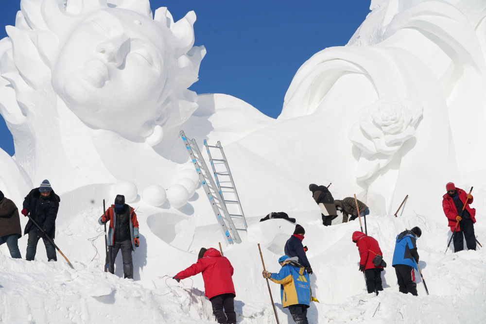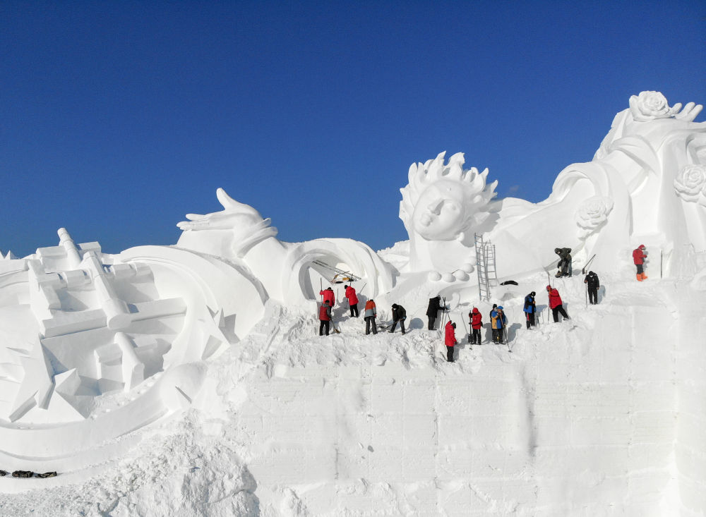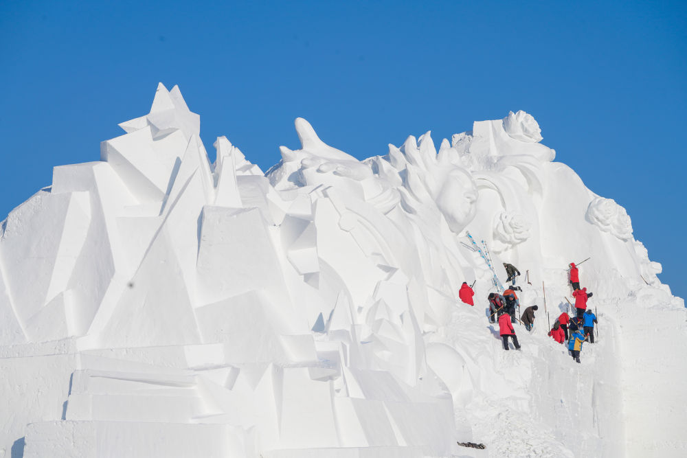 2022年12月18日,雕刻师在进行大型雪塑创作的收尾工作。