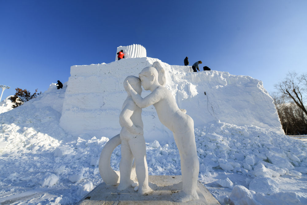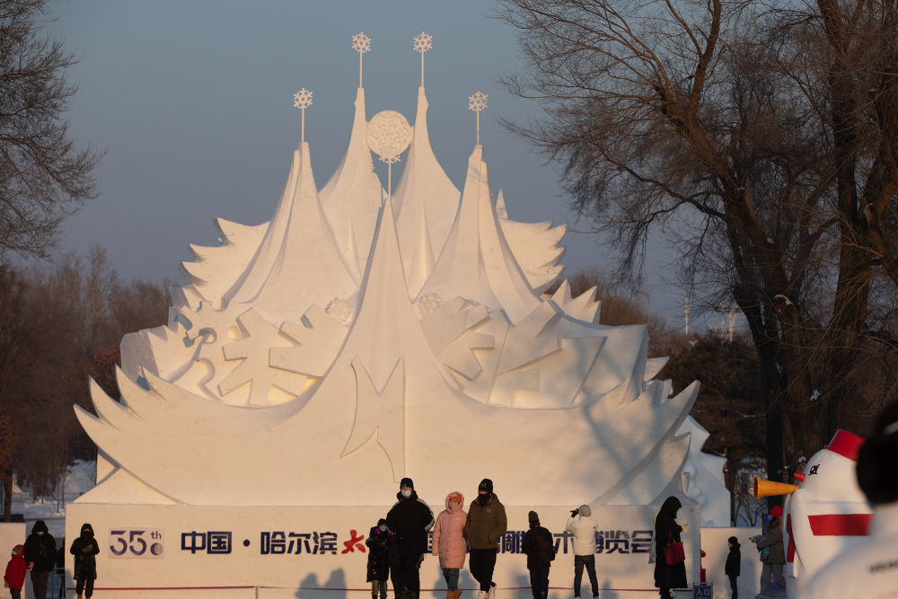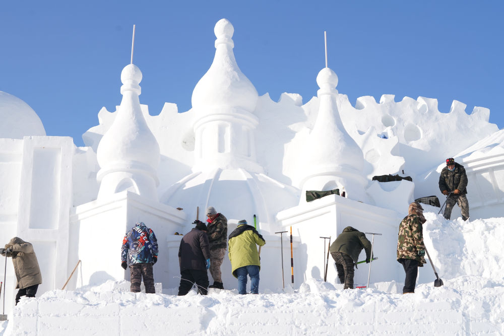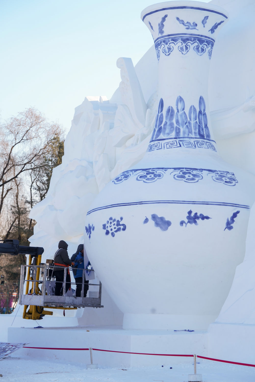 目前,第35届哈尔滨太阳岛国际雪雕艺术博览会园内各项工作有序推进。园区中所有大型雪塑作品的雕刻作业预计于12月下旬完成。