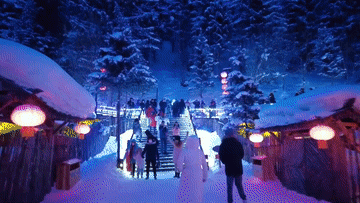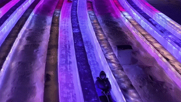 放眼望去,在这个规模超大的冰雪主题公园里,五颜六色的冰灯光怪陆离,璀璨梦幻,像是一个冰雪童话王国。