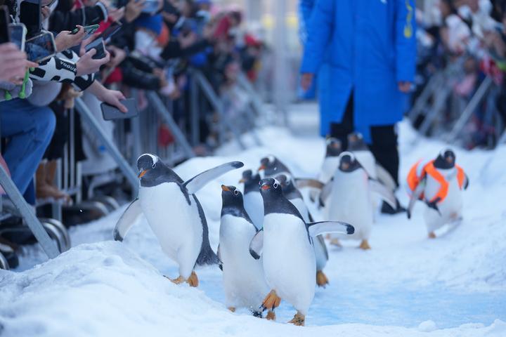 时值周末,哈尔滨极地公园的企鹅亮相户外,上演冰雪巡游,吸引许多游客前来观赏。目前正是黑龙江省哈尔滨市的冰雪旅游季。