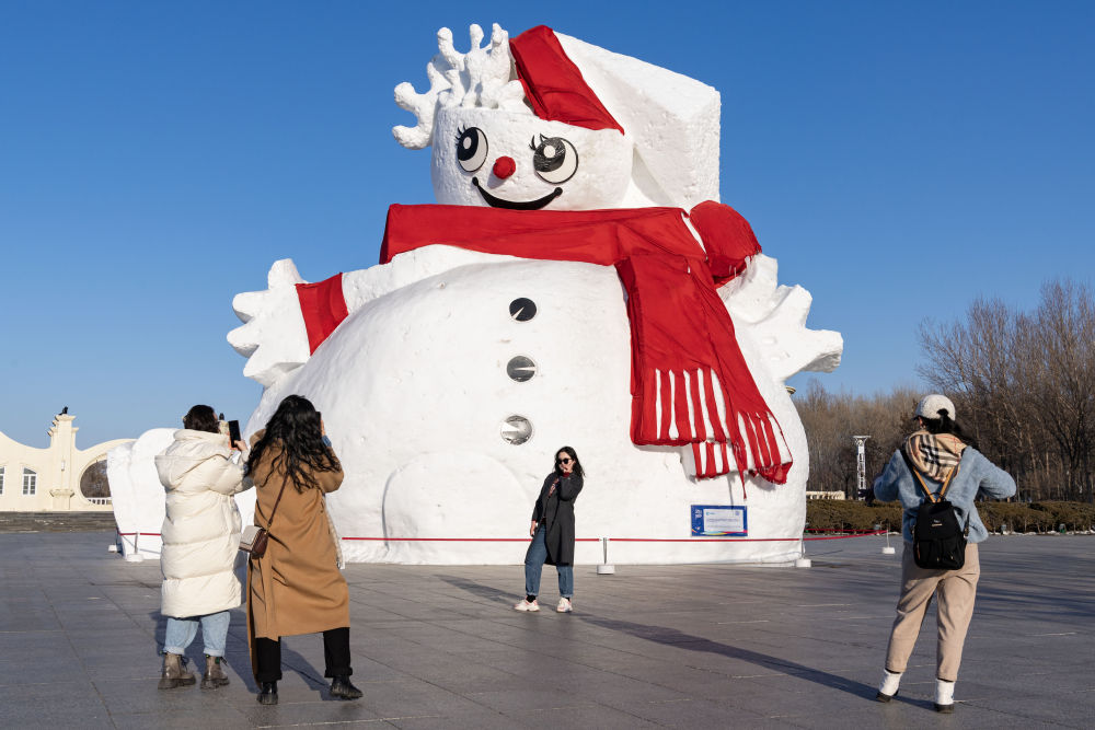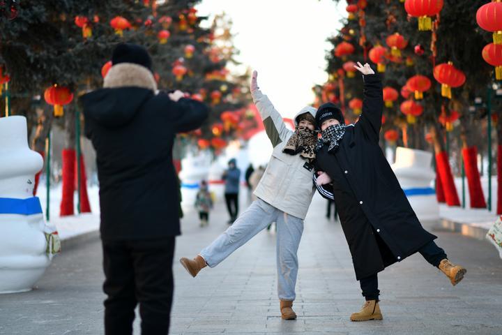 2022年12月31日,游客在第35届哈尔滨太阳岛国际雪雕艺术博览会园区内拍照留念。新华社记者 王建威 摄