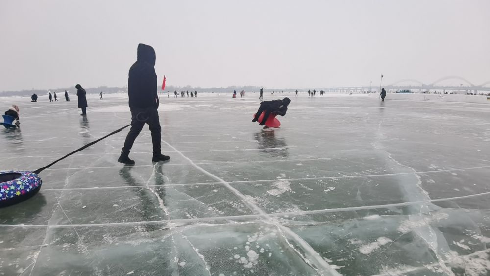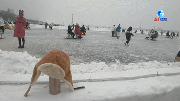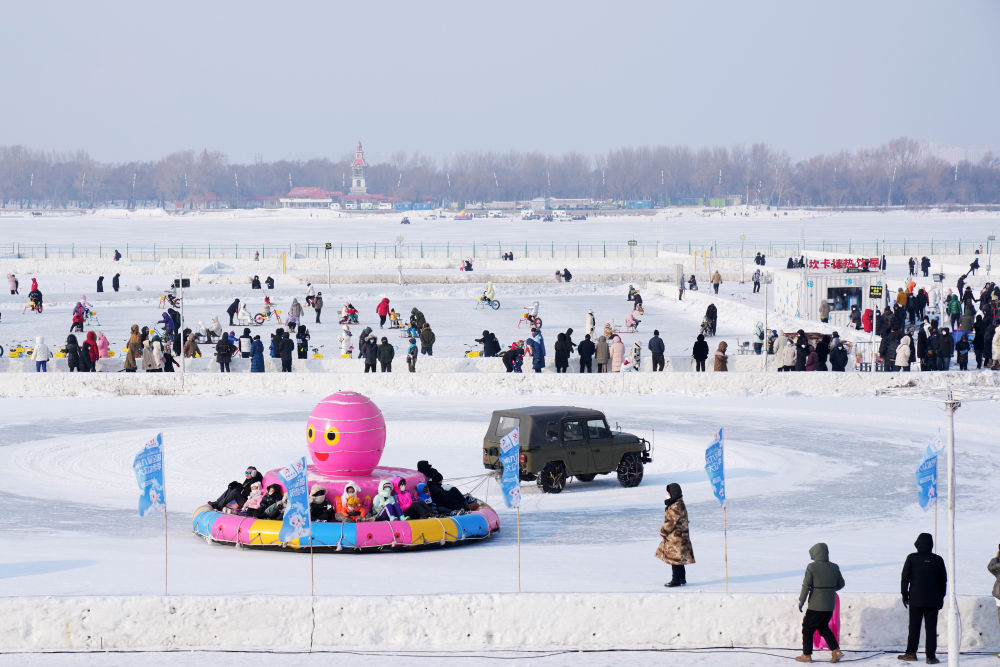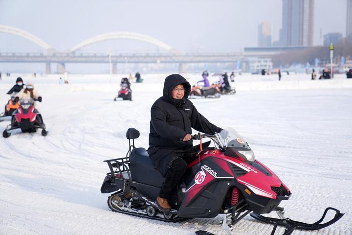 火热的采冰活动不仅“燃动”松花江面,也成为游客享受冰上运动与特色美食的热门“打卡地”。在采冰现场旁的冰上运动和娱乐体验区,游人们可以尽情享受“打出溜滑”、“滑冰车”的乐趣,再到江岸边品尝正宗的锅包肉、炖江鱼。