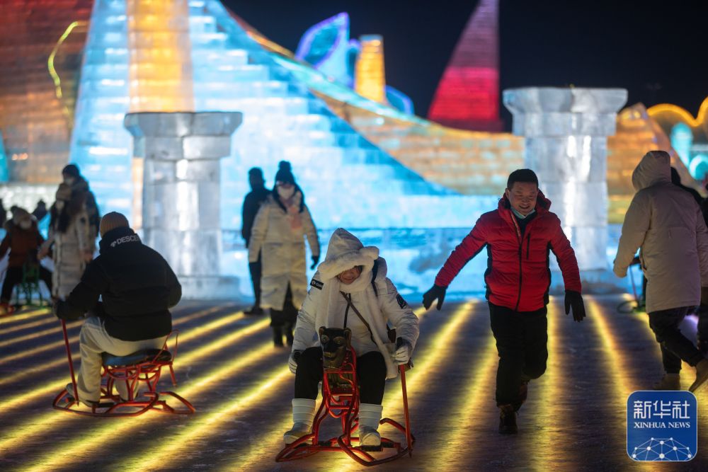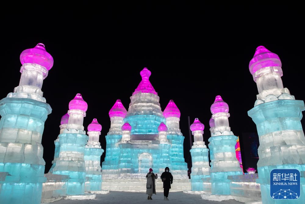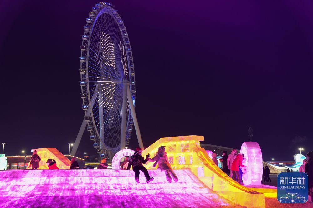 ↑2022年12月31日,游客在哈尔滨冰雪大世界园区游玩。新华社记者 王建威 摄