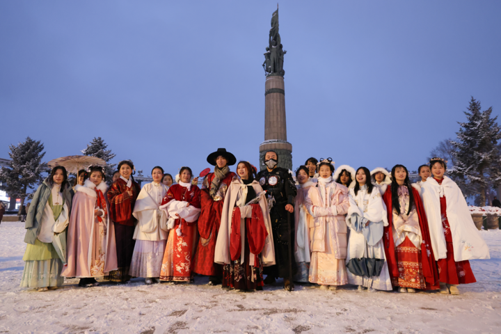 汉服巡游的最后一站是在防洪纪念塔拍照留念,来自黑龙江大学、远东理工和东北林业大学等高校的汉服社团将这一刻的幸福记录下来。
