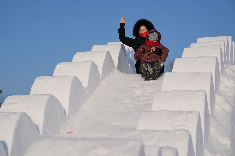 2022年12月31日,游客在第35届哈尔滨太阳岛国际雪雕艺术博览会园区内玩滑梯。新华社记者 王建威 摄