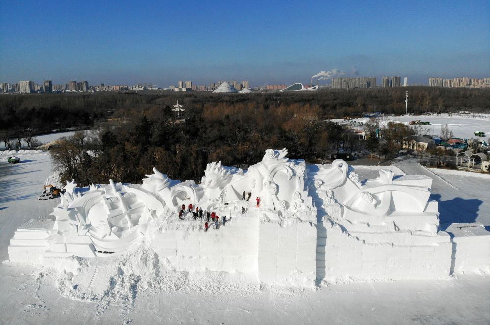2022年12月18日,雕刻师在进行大型雪塑创作(无人机照片)。