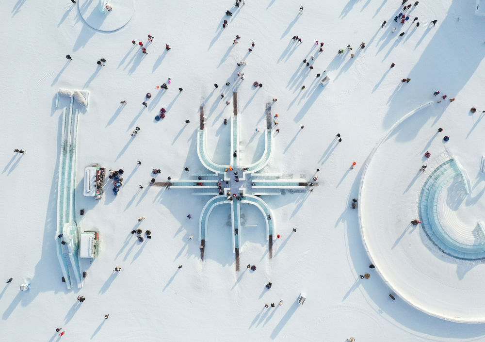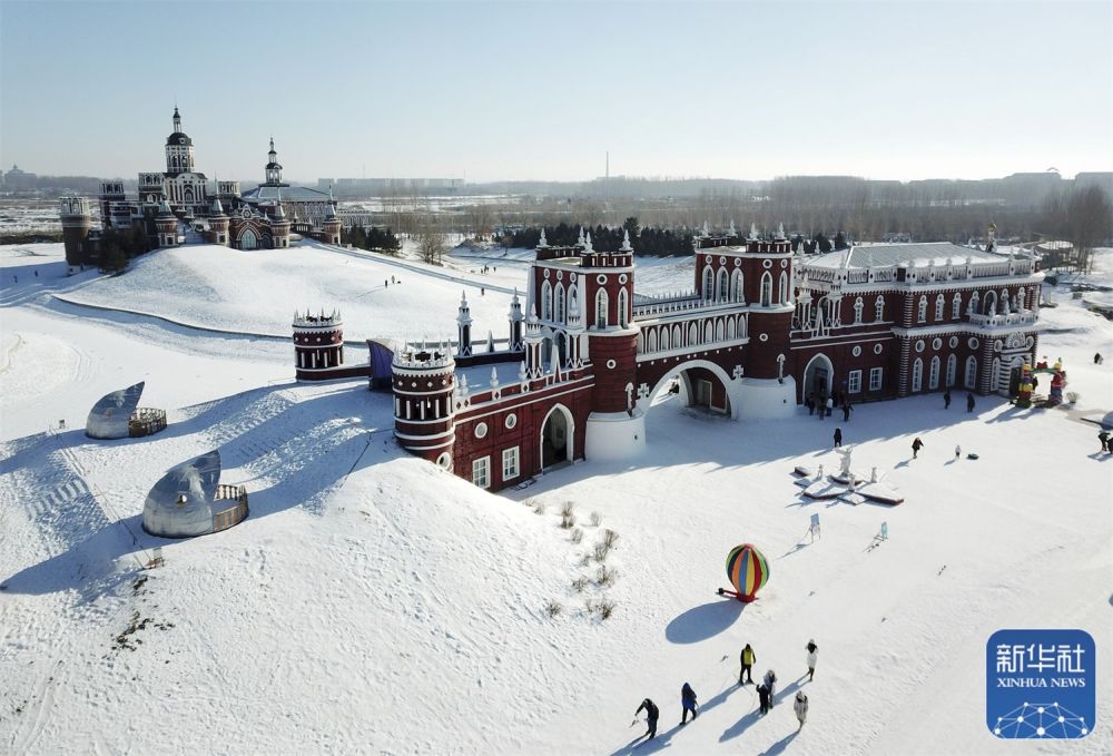 ↑2022年12月31日,游客在哈尔滨冰雪大世界园区游玩(无人机照片)。新华社记者 张涛 摄