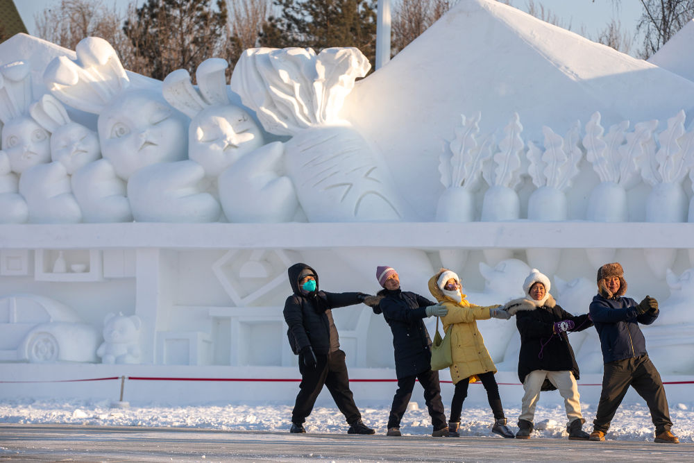 2022年12月31日,游客在第35届哈尔滨太阳岛国际雪雕艺术博览会园区内游玩。新华社记者 王建威 摄