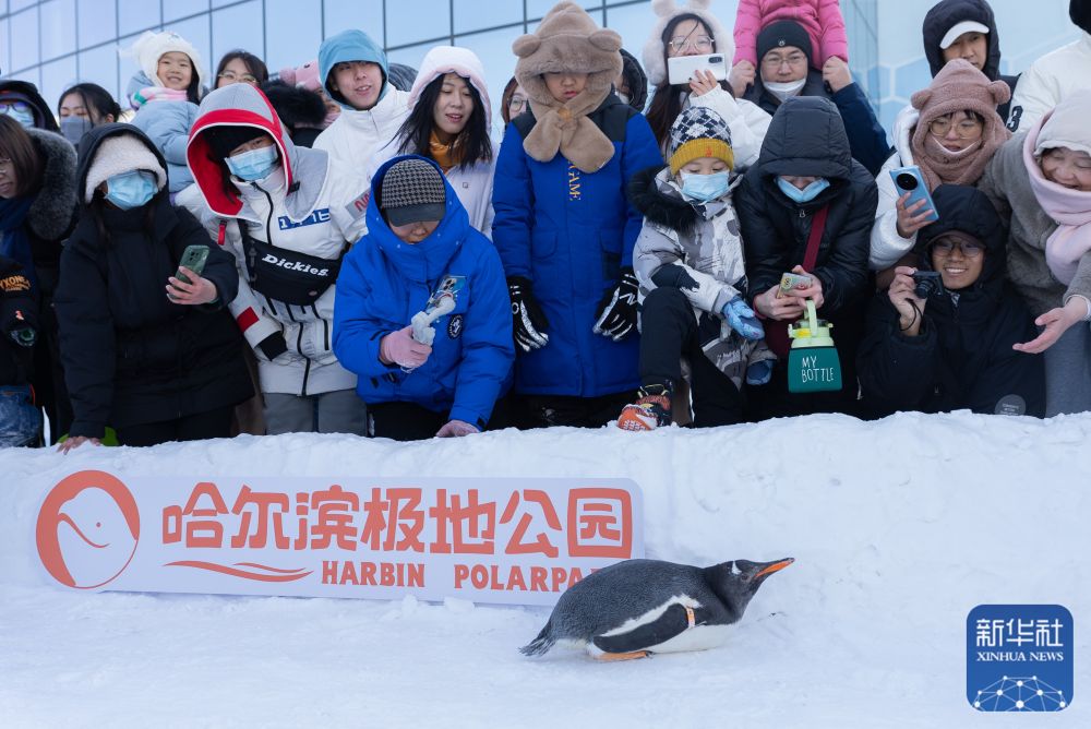 12月3日,在哈尔滨极地公园户外冰雪巡游的企鹅吸引游客围观。