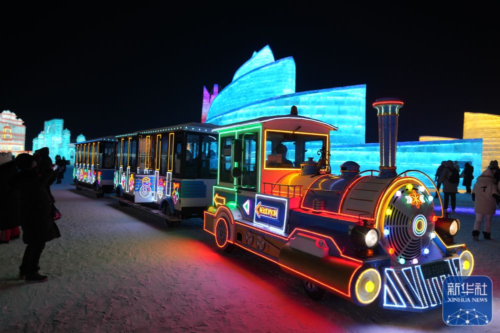 ↑2022年12月31日,游客在哈尔滨冰雪大世界园区游玩。新华社记者 张涛 摄