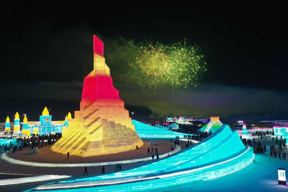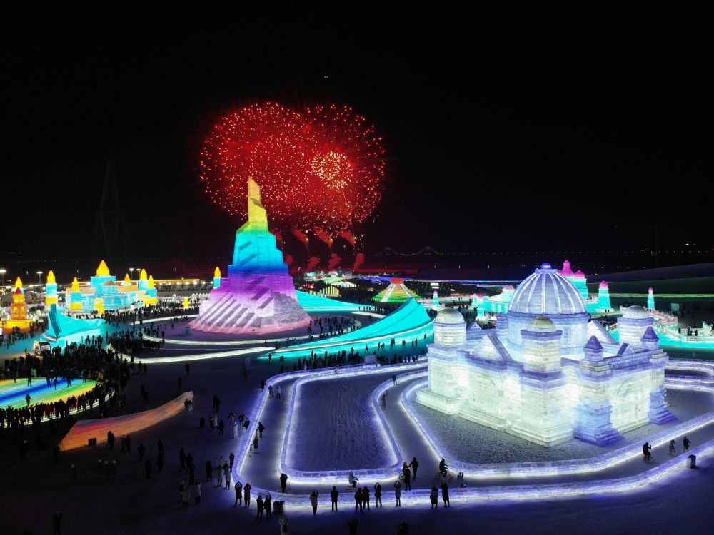 “咻咻咻”……一簇簇焰火喷薄而出,绽放在哈尔滨冰雪大世界的上空,与流光溢彩的冰雕相映衬,显得格外绚烂。