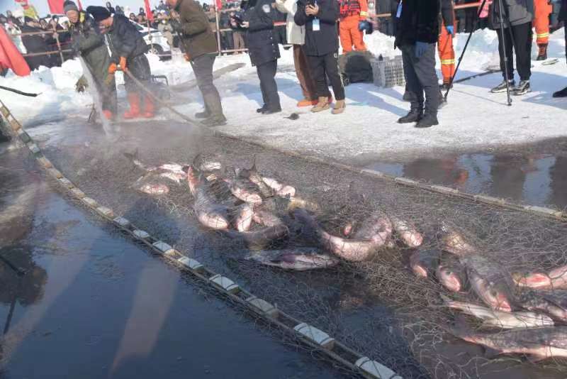 “头鱼出水喽!”鱼把头带领捕鱼汉子高喊,随之缕缕彩烟升空,爆竹声声,百米渔网破冰而出,鲫鱼、鲤鱼、白鲢、胖头等活鱼在渔网里翻腾打滚,游客们围得水泄不通,纷纷拿出手机记录,这一网捕捞活鱼2万余斤。