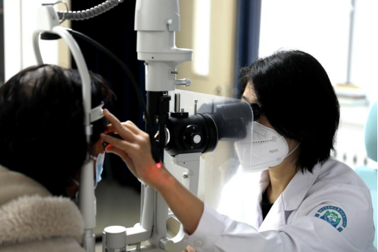 哈医大二院眼科主任医师曲巍为患者做眼部检查