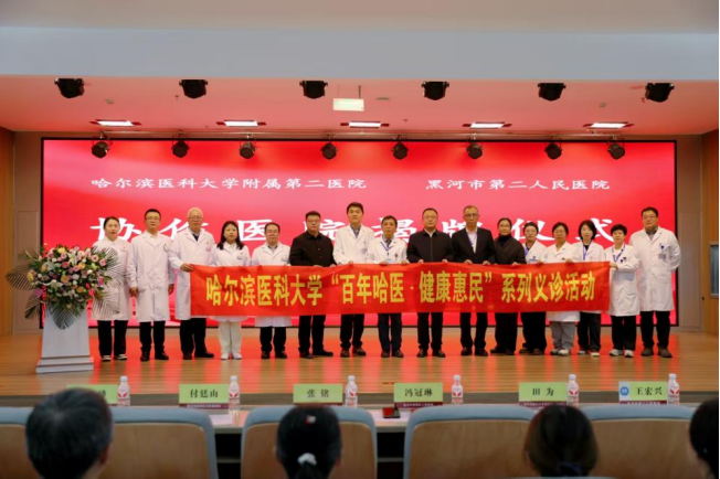 为迎接哈尔滨医科大学百年校庆,哈医大二院深入贯彻落实大学关于开展“百年哈医健康惠民”系列义诊活动的指示精神,11月8日,由对外联络部部长张铭带领11人医护团队,抵达黑河市第二人民医院,进行医联体协作医院签约、揭牌和开展义诊惠民活动。哈尔滨医科大学附属第二医院内分泌代谢病科主任乔虹教授的“龙江名医团队工作室”和心血管内科牛春峰教授的“名医团队工作室”落户黑河市第二人民医院。
