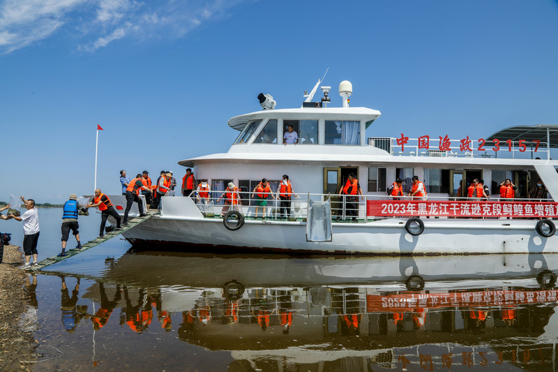 7月3日,2023年黑龙江干流逊克段鲟鳇鱼增殖放流活动在黑龙江省逊克县车陆乡卫东村黑龙江水域举行,当地村民、志愿者在水产专业人士的指导下,在江中心位置船舶的放流平台上,向黑龙江放流了15.6万尾鲟鳇鱼幼鱼。