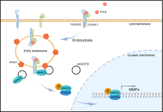 在分子机制层面上的探究,研究团队通过TRAP、质谱、RNA Pull-down、co-IP,RNA体外环化,FISH、分子对接等一系列实验充分明确了circEIF3I充当SMAD3与AP2A1蛋白间的分子支架,促进SMAD3蛋白向早期内体富集,使得内化的TGFβR1激活SMAD3,而激活的SMAD3在核转位后促进MMPs的转录最终促进胰腺癌细胞侵袭与迁移。本研究进一步丰富了circRNA调控胰腺癌转移的分子机制,也成为本研究的特色和创新之处。
