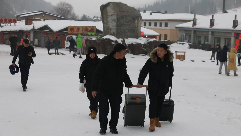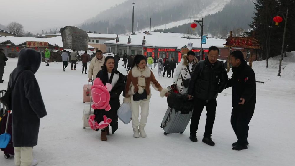 “我们21日凌晨就紧急召开了会议,针对第二天的游客出园疏导问题进行认真的研究部署,凌晨三点多钟就出动了压雪机,对整个景区的道路、停车场地面进行了压雪防滑。”雪乡景区所在地双峰林场党支部书记杨荣涛一边帮游客拉拉杆箱一边说。