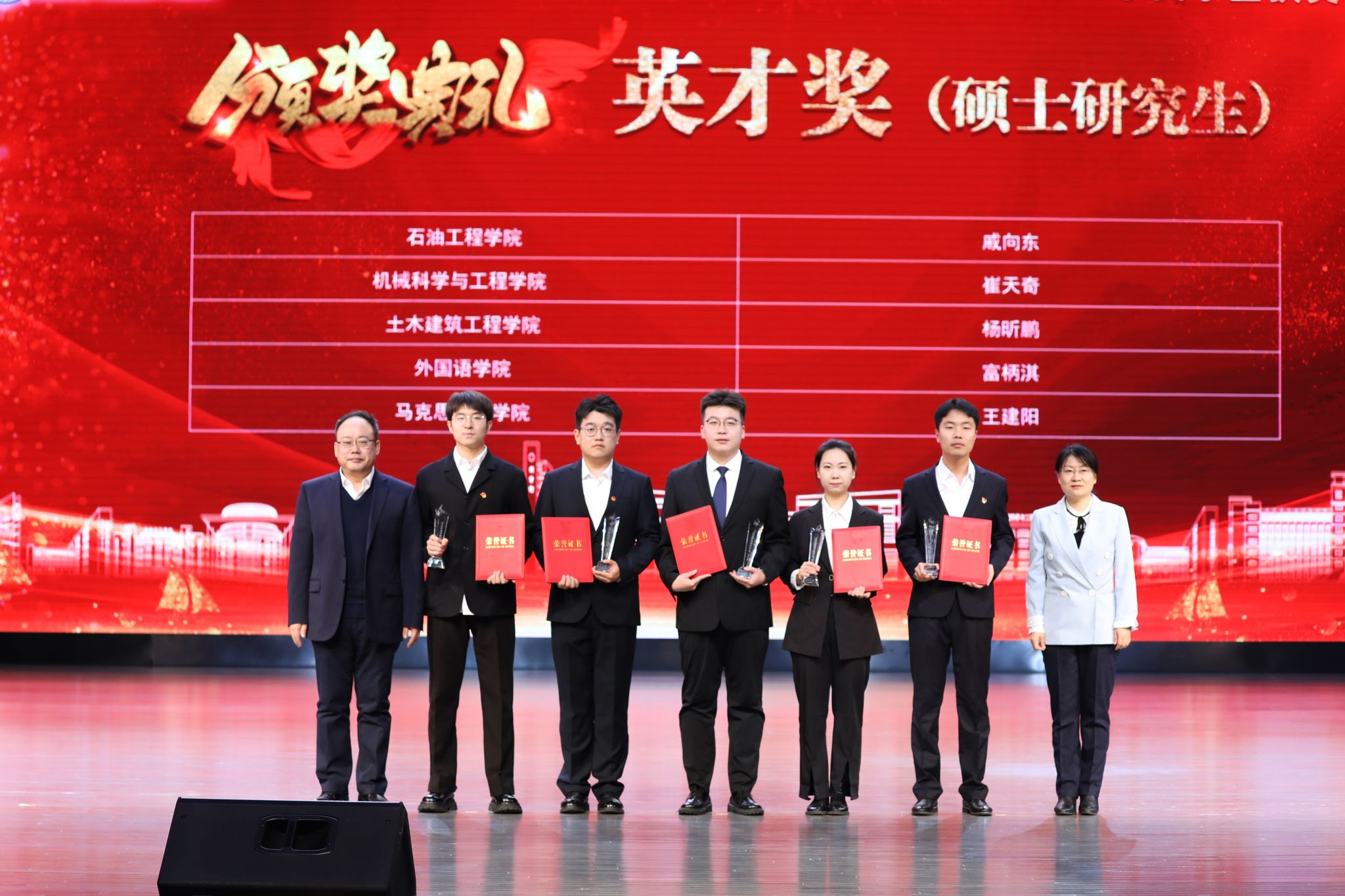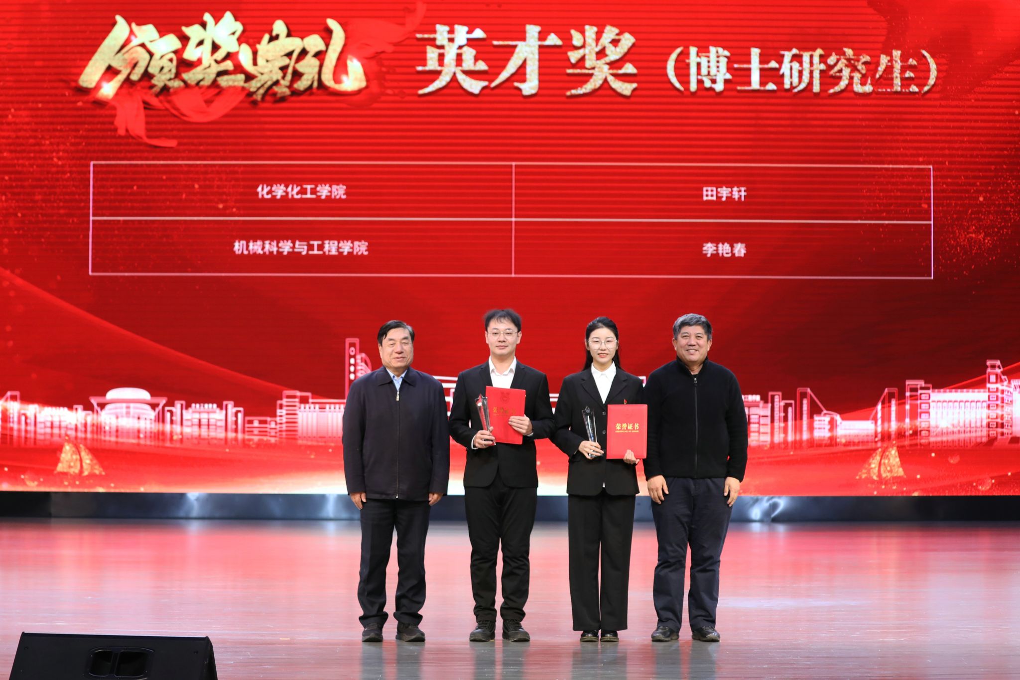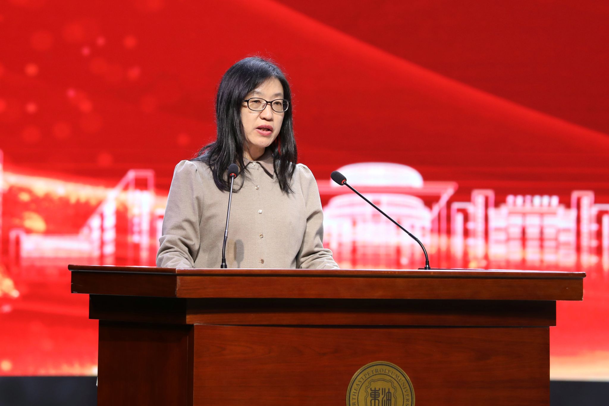 东北石油大学校长董宏丽宣读东北石油大学第一届王玉普励学奖学金获奖名单。参会领导嘉宾为第一届王玉普励学奖学金获奖者颁奖。