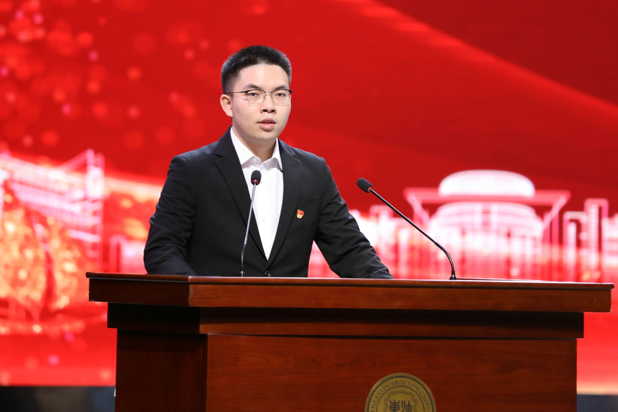 获奖学生代表、机械科学与工程学院严天佑向王玉普院士、各位捐赠人、学校、老师表示感谢,表示要心怀感恩、不负期待、勤学知识、苦练本领,传承弘扬大庆精神(铁人精神),接过老一辈石油人手中的旗帜,助力国家能源事业发展,让青春在中国式现代化火热实践中绽放绚丽之花。