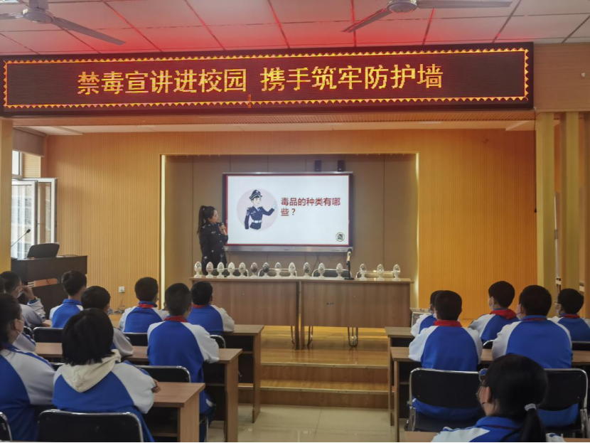 活动中,禁毒大队民警利用多媒体设备播放禁毒视频、与学生互动答题、发放禁毒宣传手册及仿真毒品展示等多种方式为学生详细讲解禁毒相关知识。为使学生能更全面地了解新型毒品的危害、树立防范意识,禁毒民警针对新型毒品依托咪酯、成瘾性药品美沙片滥用的危害进行了重点讲解。课后学生纷纷表示学习到了新的知识,在今后的生活中要提高警惕、远离毒品。