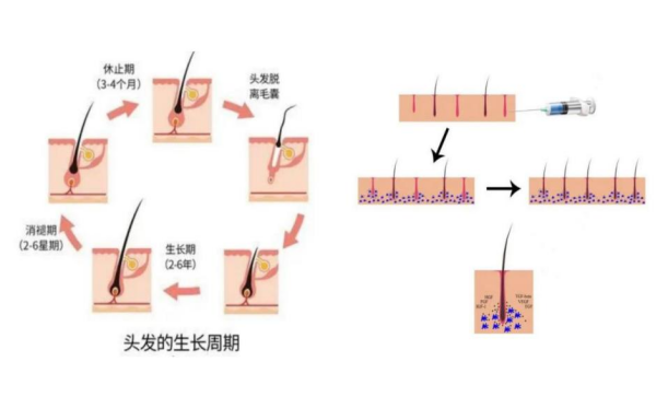 据哈医大二院输血科负责人汪辉介绍,应用机采富血小板血浆技术进行局部治疗是通过采集自体血液分离的血小板浓缩物,激活后可释放大量生长因子,如胰岛素样生长因子、表皮生长因子、成纤维细胞生长因子等,可激活外调节蛋白激酶(与细胞增殖分化相关的细胞)等通路,促进真皮乳头细胞的增殖,抑制细胞凋亡,从而延长毛发寿命;另外生长因子能够作用于毛囊干细胞,刺激干细胞分化形成新的毛囊和血管。