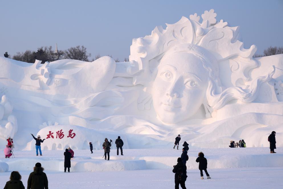12月28日,游客在第36届哈尔滨太阳岛雪博会主塑《雪绒花》前游玩拍照。新华社记者 王建威 摄
