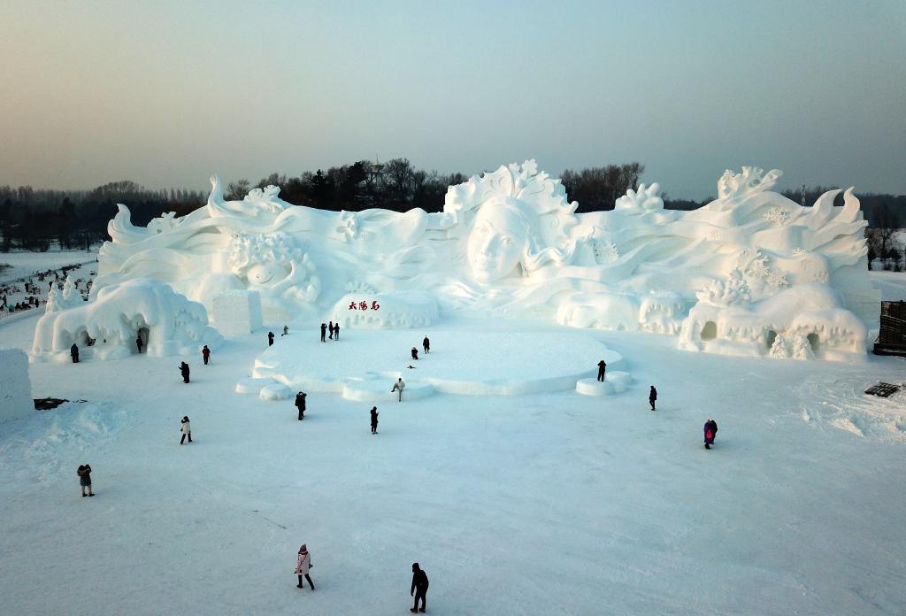 12月28日在第36届哈尔滨太阳岛雪博会拍摄的主塑《雪绒花》(无人机照片)。新华社记者 王建威 摄