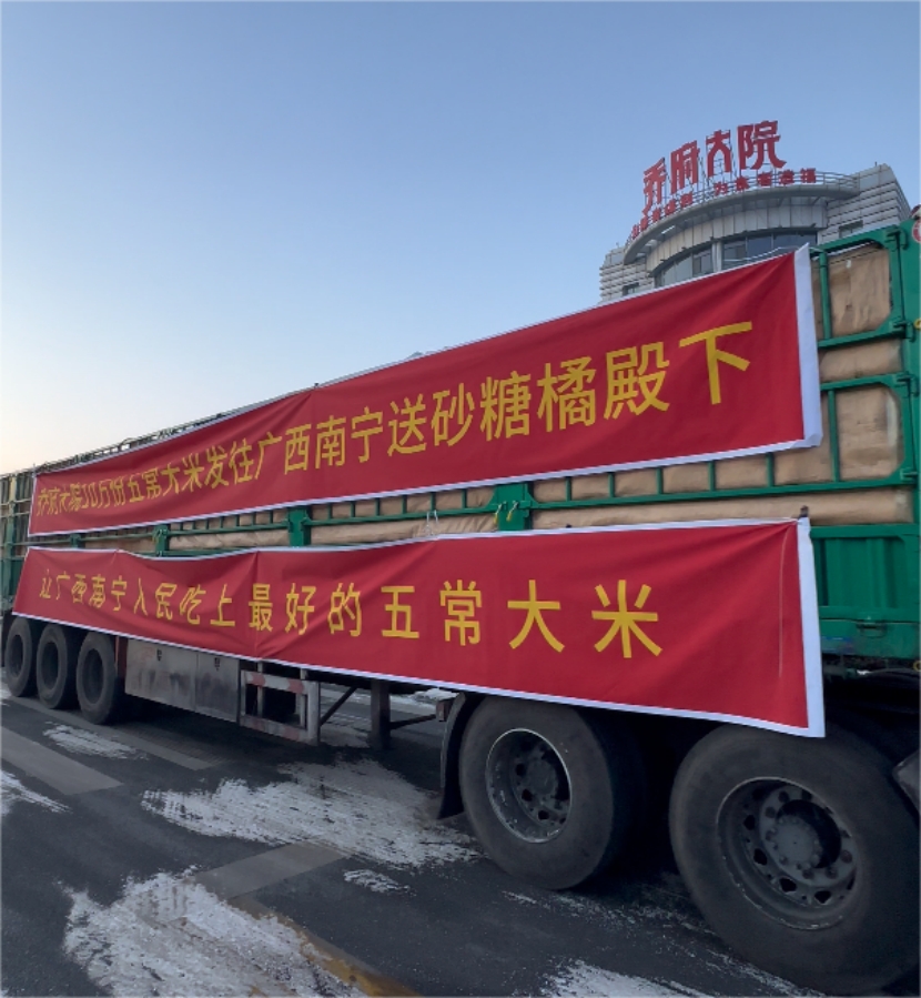1月7日,在五常市乔府大院农业股份有限公司(以下简称“乔府大院”)院内,几十名员工将打包好的五常大米陆续装车。下午,满载着乔府大院五常大米的货车整装出发,它们即将跨越4000公里,到达南宁后面向市民免费发放,让广西朋友们感受到这份来自“中国稻乡”的美味。