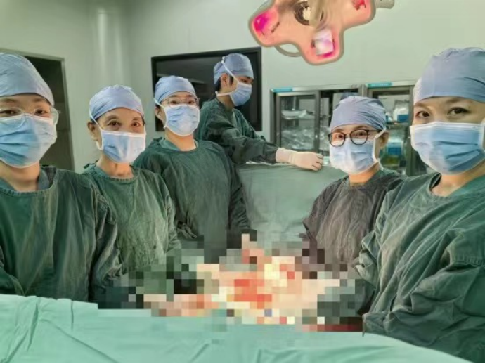 经过详细的检查,哈医大一院群力院区妇科郑建华教授发现,小琪看似怀胎十月的巨大腹型,其实是患者盆腹腔长着一个巨大肿物。经过术前全面评估,邀请麻醉科、普外科等多学科进行术前讨论,考虑到患者十分年轻且尚未婚育,家属有保留生育功能的强烈愿望,最终选择为患者行剖腹探查术。