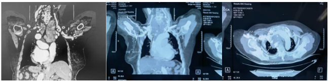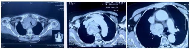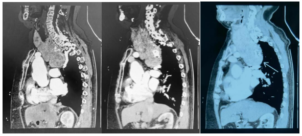 患者由于肿瘤长期压迫心包和肺动、静脉,已经出现心包积液,并伴有严重的房颤、三尖瓣重度反流、肺炎。哈医大肿瘤医院头颈外科鼻咽喉口腔二病房项丞教授经过专业判断,发现肿瘤的来源是甲状腺,虽然颈部的包块并不明显,但肿瘤向下生长,从颈部一直长到胸部,成为了“压在心里的大石头”。
