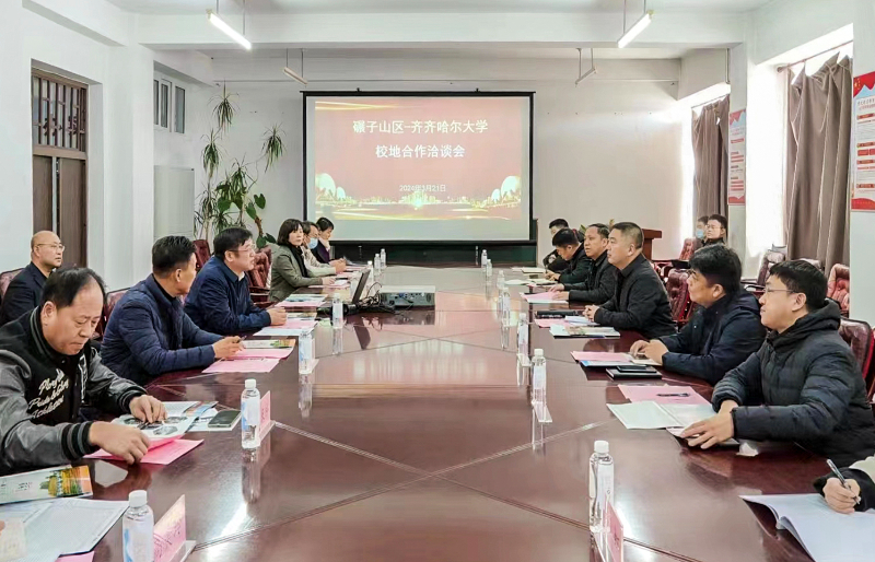 在齐齐哈尔大学,一行人与校方举行了座谈会,学校相关负责人全面阐述了与碾子山区的意向合作方向。王云峰介绍了碾子山区发展概况,提出具体合作需求。与会双方进行了深入交流,就实习实训、人才引进、基地建设等方面达成合作意向11项。