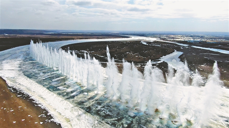 当日下午,随着爆破指令发出,短短几秒的时间,航标号262到264之间的黑龙江江面上,便瞬间形成了几十米高的冰雾柱和三公里长的破碎段,场面非常壮观。(叶兵 记者 张磊摄)
