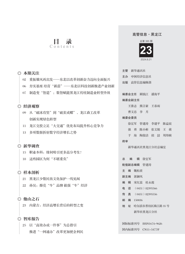 《高管信息》是新华社主管、中国经济信息社主办,具有国内统一刊号的经济信息期刊,主要刊登新华社记者采写的参考报道、决策信息,传达中央最新精神、解读最新方针政策,介绍各地各领域新成就、新经验以及遇到的新问题、新情况。《高管信息·黑龙江》紧紧围绕龙江各地党委政府中心工作,聚焦经济社会发展经验做法、问题困难、对策建议,为各级党政机关、企事业单位领导提供决策参考。