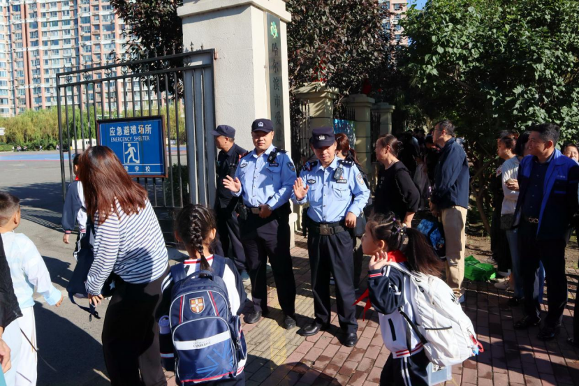 9月2日,新学期开启,哈尔滨市公安局道里分局执勤民警、辅警们早早来到学校、幼儿园,开展秩序维护、引导同学们有序入校。