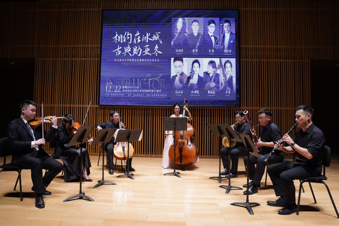 12月23日,由哈尔滨音乐学院主办,哈尔滨音乐厅、黑龙江省侨联青年委员会协办的“相约在冰城 古典助亚冬——哈尔滨音乐学院管弦系教师室内乐音乐会”在哈尔滨音乐厅举行。