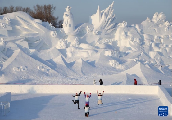 1月5日,人们在哈尔滨冰雪大世界园区内的第九届亚冬会吉祥物雪雕旁游玩。新华社记者 王建威 摄