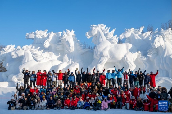 1月8日,第27届哈尔滨国际雪雕比赛参赛选手在太阳岛雪博会园区内合影。来自10个国家20余支代表队的雪雕艺术家在哈尔滨太阳岛雪博会园区同场竞技。新华社记者 张涛 摄