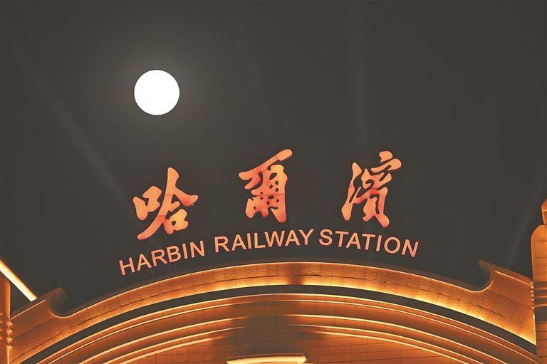6日晚,一年又中秋,赏月正当时,一轮满月高高地悬挂在哈尔滨火车站的上空。记者 郭俊峰摄