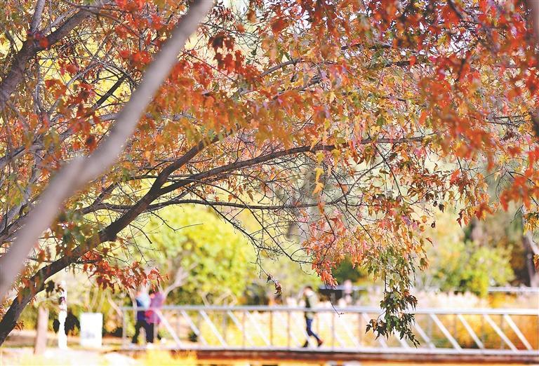 近日,哈尔滨市道里区群力景江东路附近的绿地、公园内,树上的叶子五彩斑斓,地面上铺了一层落叶,美丽的秋景如同油画一般,吸引人们驻足观看、拍照。国庆中秋假期,冰城随处可见迷人的秋色,市民不出市区便可观赏到美景。(记者 苏强摄)