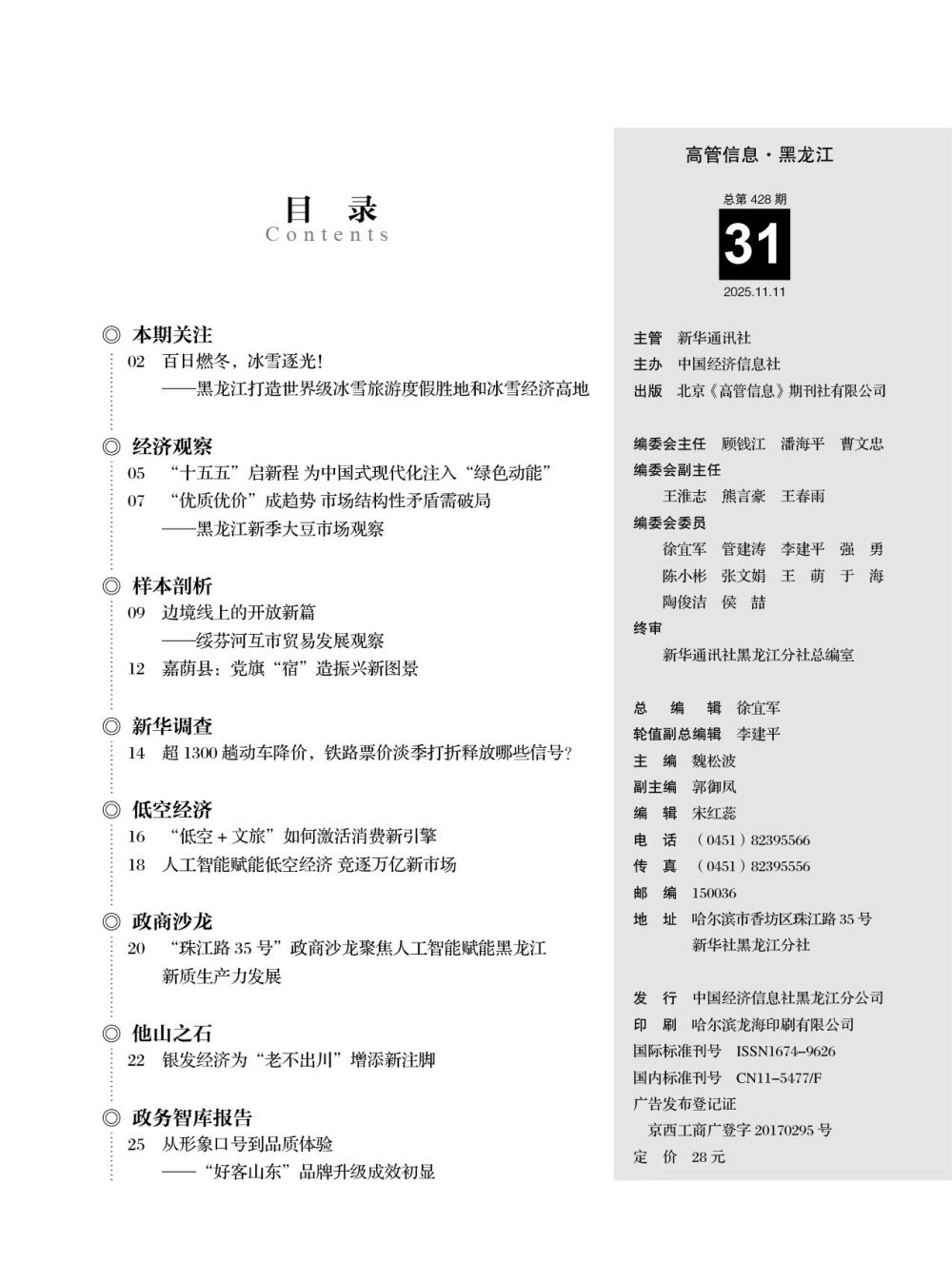 《高管信息》是新华社主管、中国经济信息社主办,具有国内统一刊号的经济信息期刊,主要刊登新华社记者采写的参考报道、决策信息,传达中央最新精神、解读最新方针政策,介绍各地各领域新成就、新经验以及遇到的新问题、新情况。《高管信息·黑龙江》紧紧围绕龙江各地党委政府中心工作,聚焦经济社会发展经验做法、问题困难、对策建议,为各级党政机关、企事业单位领导提供决策参考。