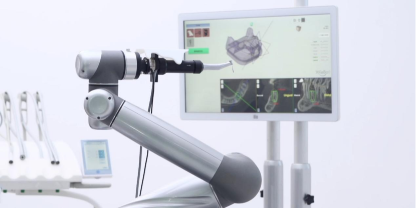 毕庆伟和团队反复琢磨,先为赵先生制作了一副活动义齿,并决定使用口腔种植机器人为赵先生进行半口种植牙手术。手术开始,毕主任轻踩踏板发出指令,机器人机械臂自主进入患者口腔。在种植团队的密切监控下,机械臂按照术前精确规划完成了自动校准、进出口路径自动执行、自动跟踪下钻、自动提拉等手术程序,自主完成了种植窝洞预备和种植体植入等步骤,极大地简化了医生的手动操作。