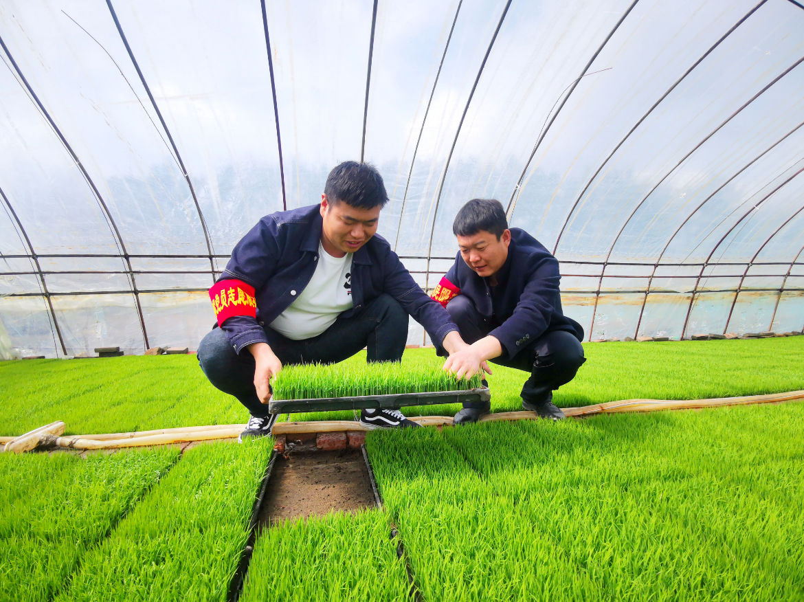 北大荒集团鸭绿河农场“红稻科技专班”党员干部正在查看暗室育秧秧苗长势。