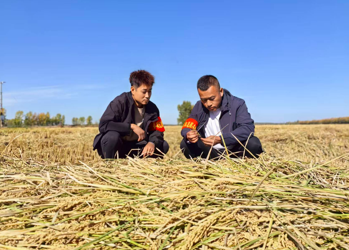 北大荒集团鸭绿河农场“红帆党小组”创新实施“二十四节气服务法”为种植户查看水稻割晒情况。