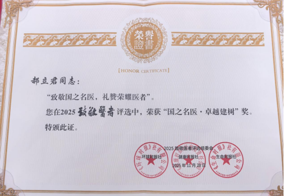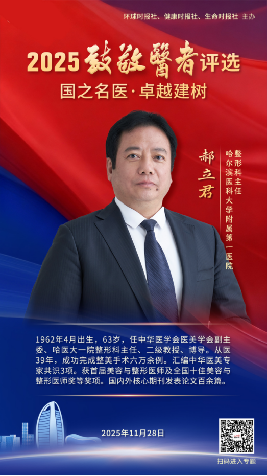据了解,2025致敬医者盛典由人民日报社属环球时报社、健康时报社、生命时报社共同主办,活动旨在表彰医术精湛、医德高尚、医风卓越的典范医者代表。郝立君教授荣获“国之名医·卓越建树”称号,展现了哈医大一院整形美容外科在全国的影响力。