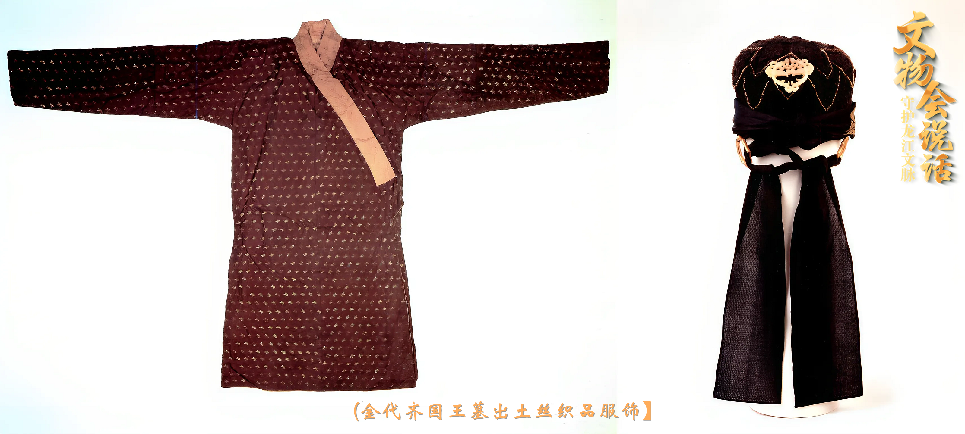 金代绿罗萱草绣鞋:1988年5月,黑龙江省的考古工作者在位于哈尔滨市道外区巨源镇城子村松花江南岸清理发掘了有“北方马王堆”之称的金代齐国王墓,出土了一大批珍贵文物。金代齐国王墓,为男女合葬竖穴土坑石椁木棺墓。棺内男性为老年,胡须尚存,腰佩玉柄短刀,双手各握一金块,身着8层17件服装;女性为中年,头部及面部用黄色丝织品包裹,腰佩饰件,项戴玛瑙金丝链,身着9层16件服装。二人头后置一楷书“太尉仪同三司事齐国王”木牌。该墓出土文物丰富、精美,保存完好,其中服装种类繁多,质料品种齐全,纺织技术高超,制作工艺精湛,图案华美,在出土文物中尤为珍贵。丝织物主要是男女服饰,分为绵、夹、单类共计30余件,有袍、衫、裙、腰带、鞋、袜、冠帽等。服饰原料有绢、绸、罗、锦、绫、纱等,经纬线排列细密,弹性、韧性良好。织工精湛,大量采用挖梭技术,织金品占有相当数量,有织金绸(绫)、织金绢、织金锦等。此外还采用印、绘、绣等技法,特别是绣法,针法灵巧多变,可分为辫绣、打籽绣、贴补绣、盘香绣、平针、接针、套针、钉线、铺线、圈金等10余种。颜色有驼、绛、棕、烟、酱、绿、青等色。花纹图案有团龙、夔龙、云鹤、飞鸟、鸳鸯、朵梅、团花、卷草、璧桃、蝴蝶、卷云等纹。袍、衫多为盘领、开裾,具有浓厚的北方民族特点。为研究宋、金时期的缫丝技术、纺织技法、印染工艺、织机种类等方面的课题提供了珍贵资料。填补了中国服饰史研究中由于缺乏金代服饰留下的空白,是我国金代考古的一次重大发现。