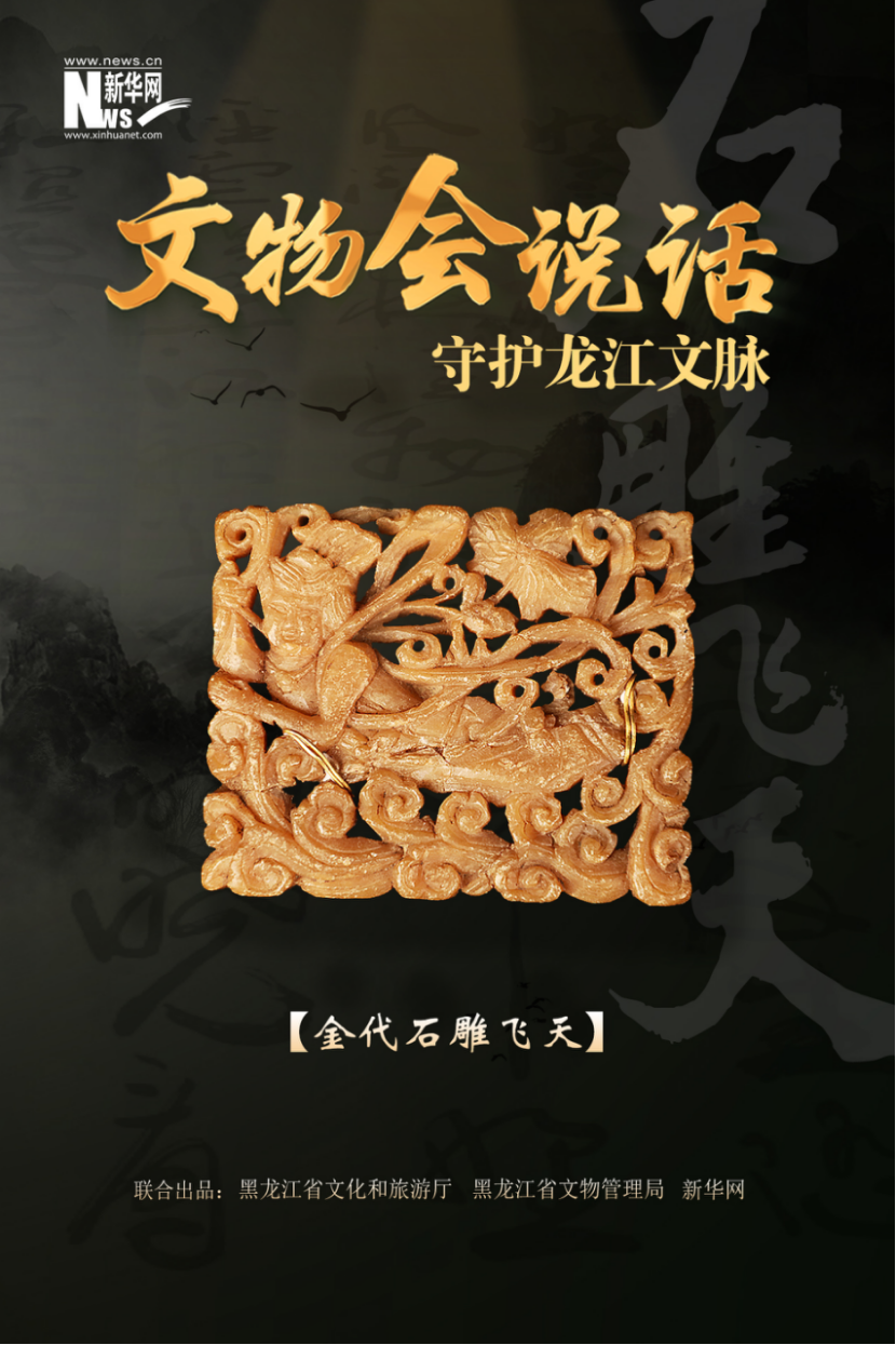 金代石雕飞天:1974年黑龙江省考古队在绥滨县中兴金墓M24号发掘出土。石雕飞天由一块褐色寿山石雕琢而成,料质温润光滑,色泽典雅。飞天在佛教中是“天地司乐之神”,每有佛会,便凌空起舞。这块石雕是黑龙江女真人墓中的随葬品,造型别致生动,动感极强。图案中部为一佛教中的飞天女神,其面相丰腴,头梳双髻,袒露上身。左臂举至胸前,掌心向内。右手拇指、食指微曲,其余三指直伸。一朵卷云遮盖了向上擎起的右臂。体态健美,衣带飘逸自如,似嫦娥奔月。上下及两侧分别衬以一朵扶摇直上的荷花和若干滚动的卷云。图中人体、衣带、卷云和荷花,以不同的动势和飞行速度,形成了强烈的音乐感和舞蹈感。作者运用圆润豪放、气脉相贯的线条工法,生动地刻画出飞天飞翔时的韵律,使飞动的形体和运动的气势融为一体。女真人原信萨满教,金朝建立后,因受汉人、契丹人影响而崇信佛教和道教。当时,“全国崇重道教,与释教同”。1123年—1135年(金天会元年—十三年),黑龙江地区佛教徒除汉人、契丹人外,其中尤以女真上层贵族居多,墓中出土的这块石雕飞天也证实了这一点。它是研究黑龙江地区女真文化及其与中原地区密切关系的重要实物。