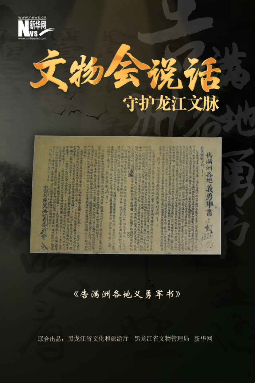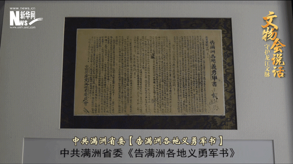1932年中共满洲省委印发的《告满洲各地义勇军书》:陈列在东北烈士纪念馆的《告满洲各地义勇军书》为黄褐色薄纸,是抗日战争时期党组织留下的真品,长26厘米、宽18厘米,用蜡纸由右向左竖排刻写,蓝色油墨印制,标题和落款“中国共产党满洲省委员会”为粗笔画大字。“九一八”事变后,在中国共产党坚决进行抗日主张和全国人民反日浪潮的推动下,部分东北军旧部和爱国民众自发组成了义勇军、救国军、自卫军、反日总队等各种名称的抗日队伍,统称为 “东北抗日义勇军”。从马占山领导的嫩江江桥抗战,到李杜和冯占海领导的哈尔滨保卫战等战斗,有力地打击了日本侵略者的嚣张气焰。中共满洲省委一直给予义勇军充分肯定和积极支持、帮助与领导。先后派遣200多名党团员和一大批抗日群众骨干到各部义勇军中工作。1932年3月31日,中共满洲省委印发《告满洲各地义勇军书》,号召和鼓励义勇军团结广大劳苦群众,与日本侵略者进行坚决斗争。在“九一八”事变后的半年多时间里,东北抗日义勇军发展到30多万人,黑龙江处处留下抗日义勇军战斗的身影与足迹,在东北抗日战争初期发挥了重要作用。